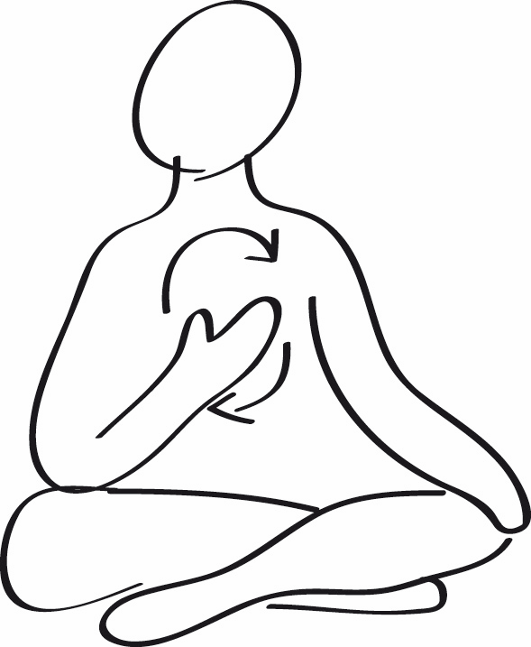 Luego coloca tu mano derecha frente a tu pecho a la altura del corazón y masajea tu chakra cardíaco, sin tocar tu cuerpo, girando la palma de tu mano en círculos en frente en sentido horario de, de derecha a izquierda. Luego haz lo mismo con la mano izquierda, manteniendo el sentido horario.